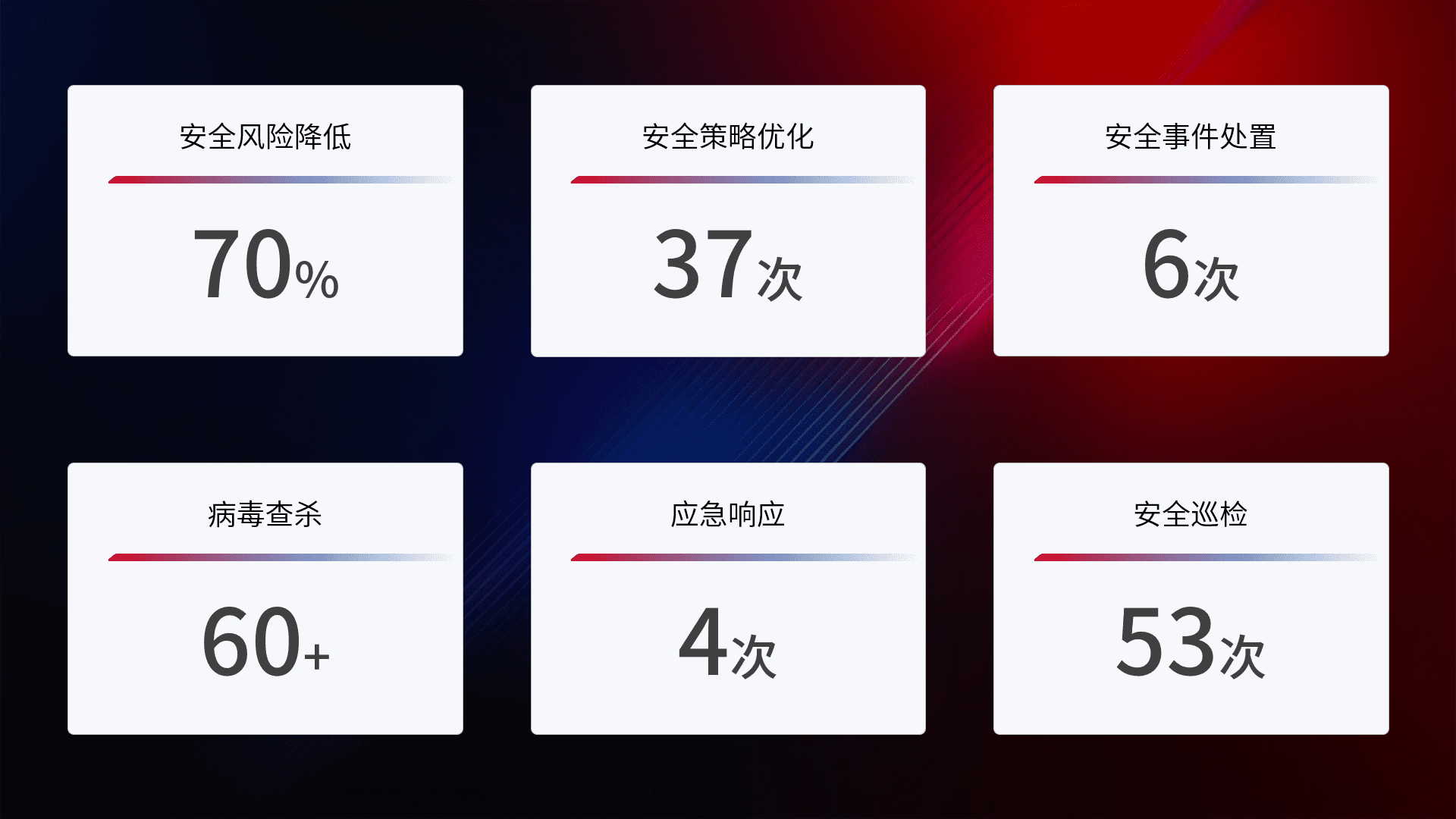 提供全面的安全事件报告体系,,包括处置报告、、、周报、、、、季度和年度总结,,,结合持续监控,,帮助客户深入了解网络安全状况。。