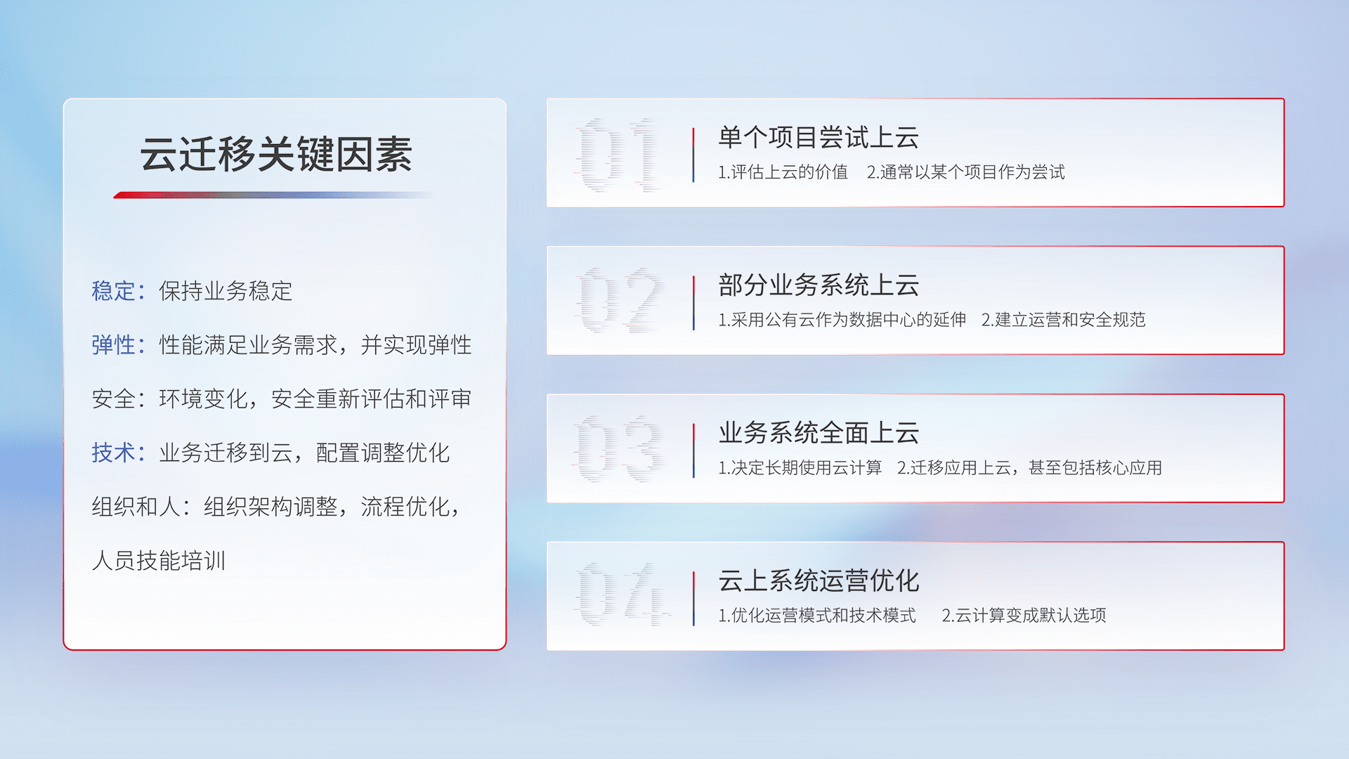 结合实际业务,,从规划设计、、云平台选型、、云原生改造、、、数据迁移、、、、集成交付,,迁移全过程为客户识别最佳上云路径,,,,做好风险识别管理,,,,设计网络架构、、、身份权限、、、、安全审计合规、、、、操作审计、、、日志审计、、监控告警策略、、、、多站点容灾设计等,,对云上基础设施进行整体规划,,,提升IT治理水平,,,,以满足弹性、、高可用、、高性能的需求。。。
